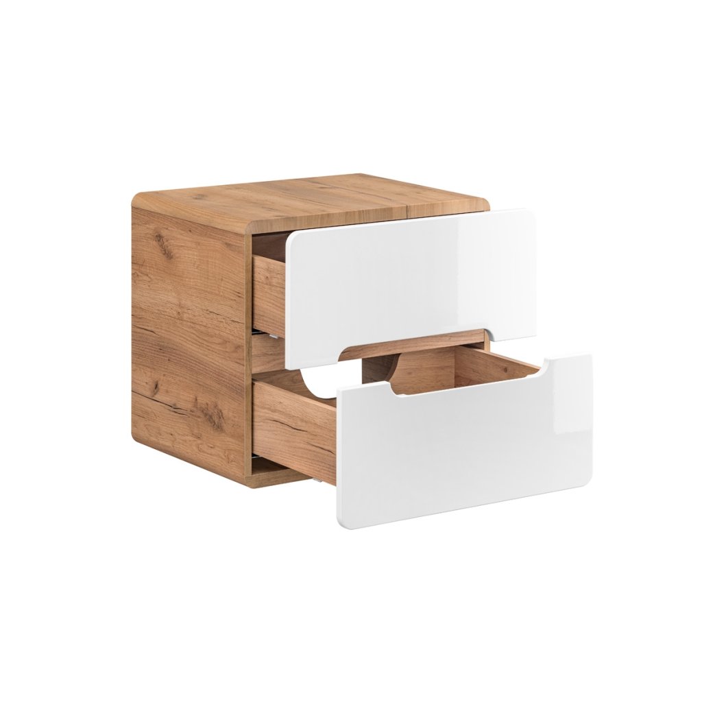 Kolekce Aruba White představuje moderní koupelnový nábytek v dekoru zlatého dubu v kombinaci s lesklou bílou barvou. Kolekce splňuje ty nejnáročnější požadavky. Nábytek byl navržen s ohledem na praktičnost při současném zachování elegantního vzhledu. Veškerý nábytek z kolekce je proto nástěnný, bezúchytkový, čela skříněk jsou vybavena systémem tichého dovírání a celkový moderní design nábytku dotváří zaoblené rohy. Kolekce zahrnuje umyvadlové skříňky do koupelny i na WC, nástěnné skříňky s poličkami a horní zrcadlové skříňky.