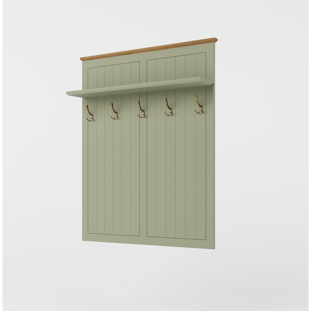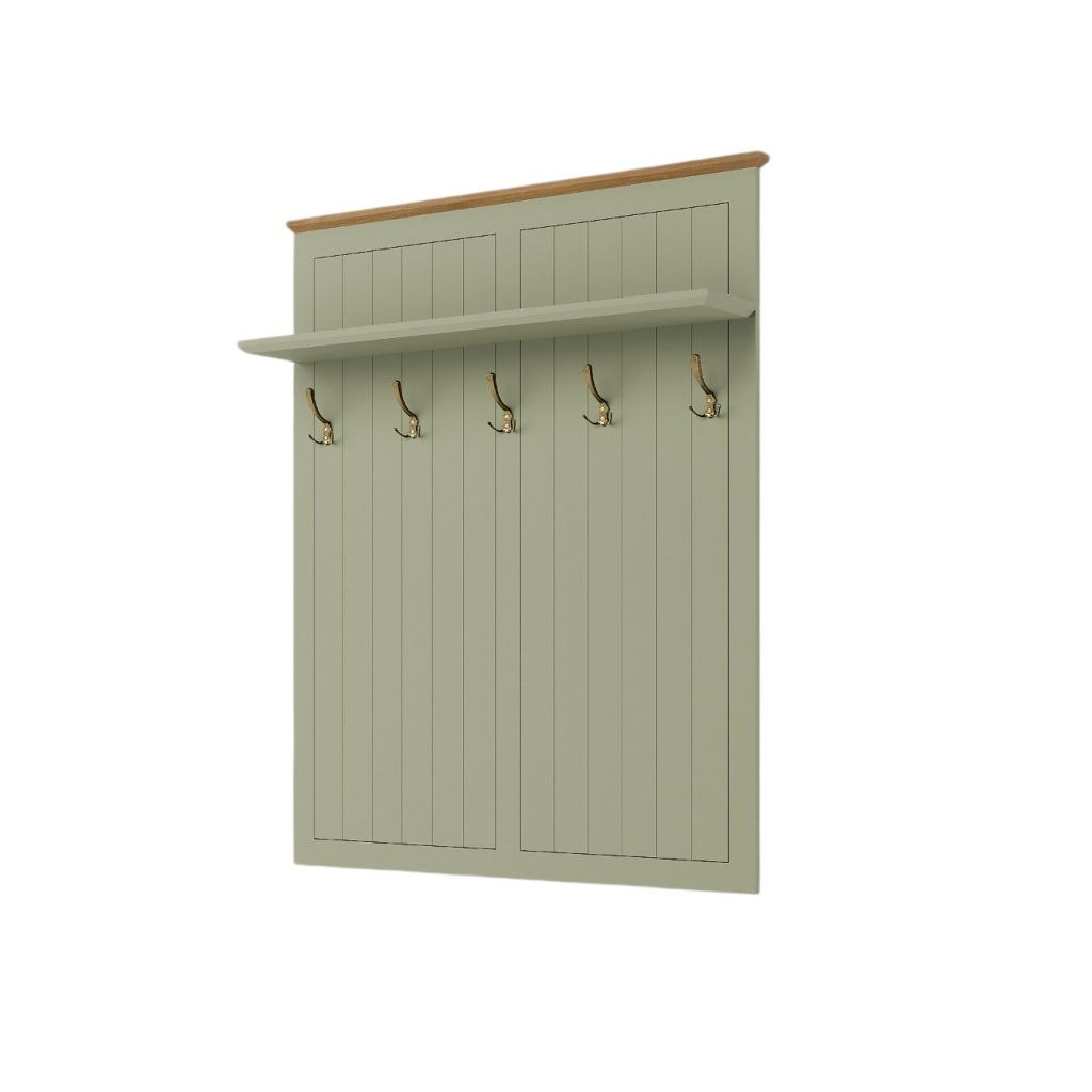 Masivní věšákový panel PROVENCE je předsíňová stěna vyrobená z masivního bukového dřeva, které je ošetřeno akrylovou barvou v olivovém odstínu, a z masivního dubového dřeva (horní deska), které je ošetřeno lakem. Díky spojení těchto dvou druhů masivního dřeva získal masivní panel jedinečný vzhled, který zdokonalí Vaši předsíň.