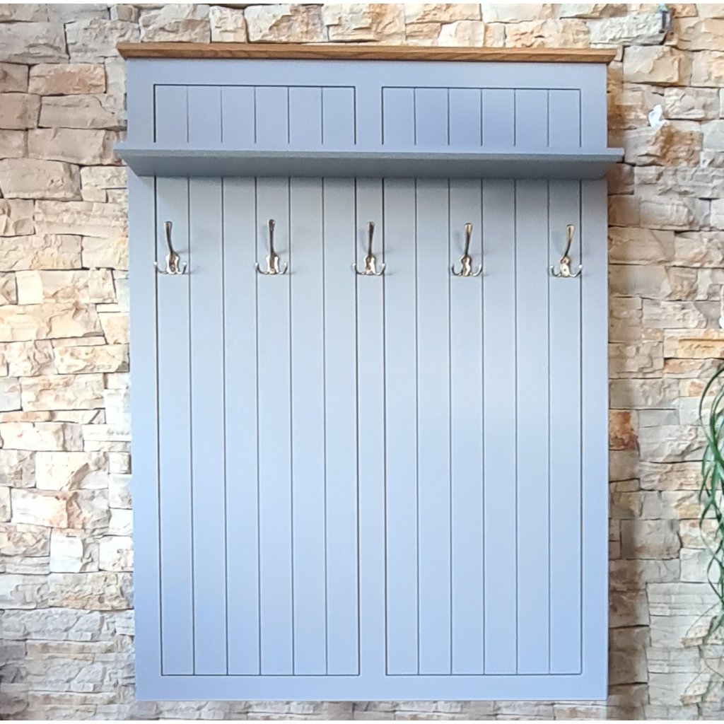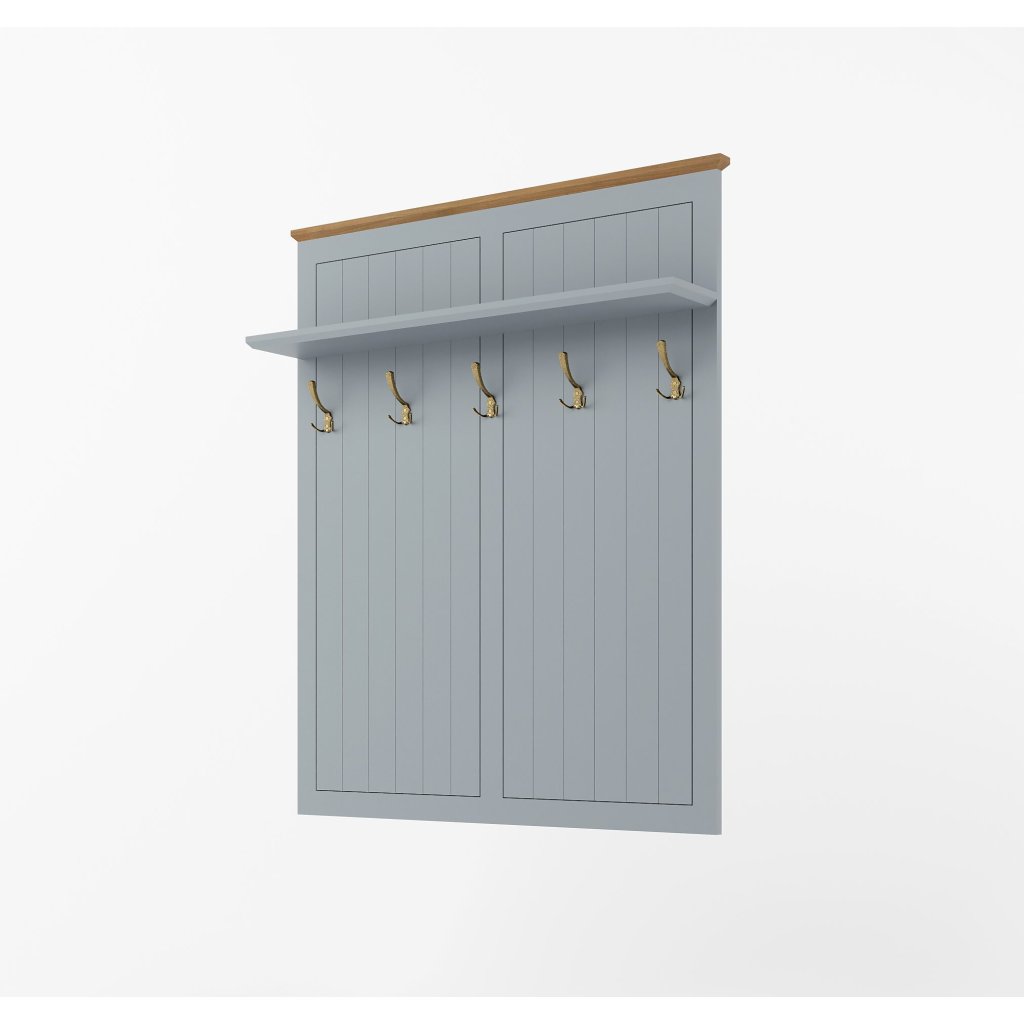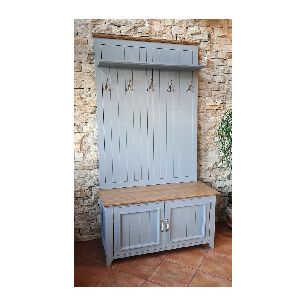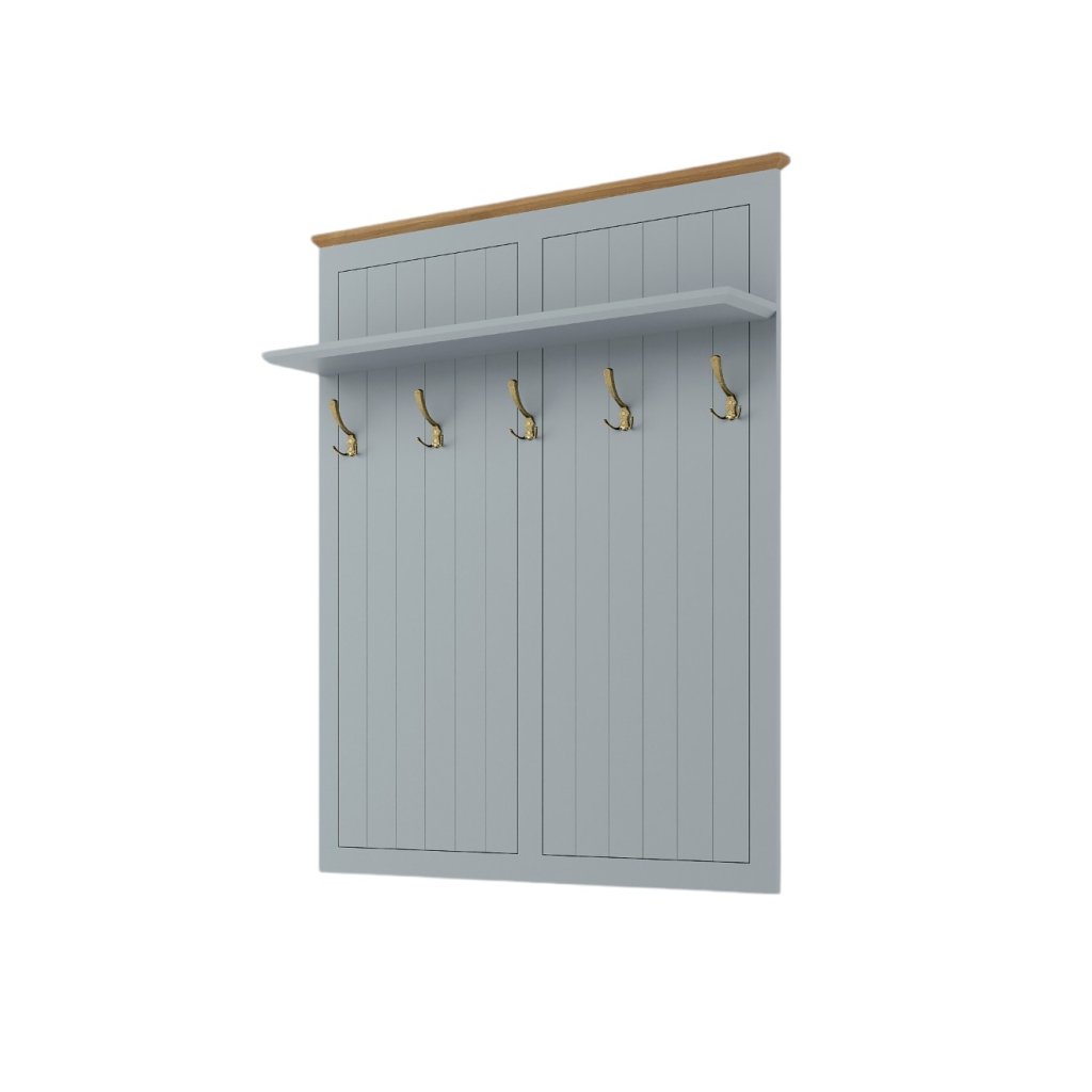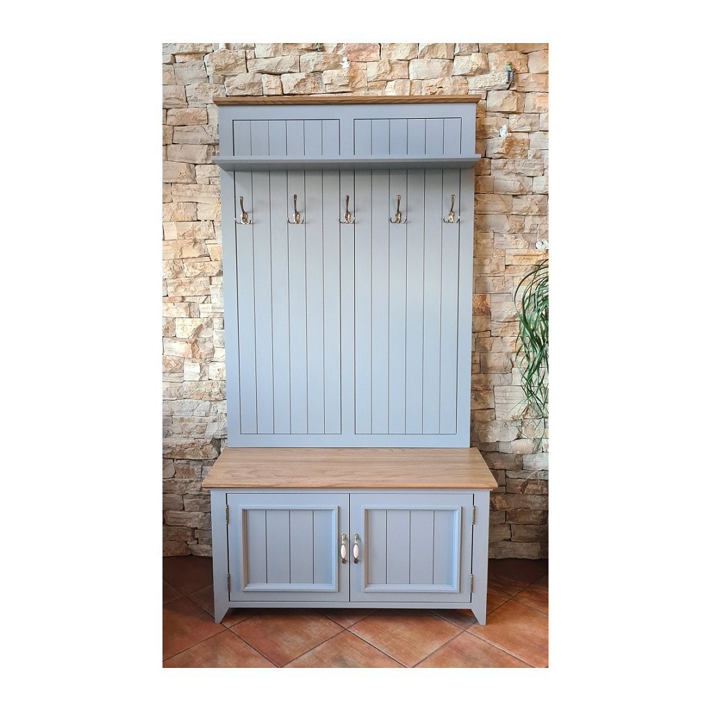 Masivní předsíňová stěna PROVENCE je spojením bukového a dubového dřeva. Dubové dřevo (horní deska) je ošetřeno lakem a bukové dřevo je ošetřeno akrylovou barvou v bílé či šedomodré barvě.