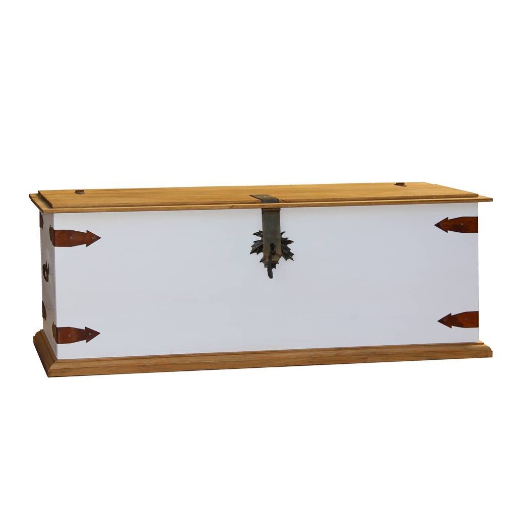 Masivní truhla SWEET HOME je vyrobena z masivní borovie a ošetřena bílou vodou ředitelnou barvou. Hnědé plochy mohou být ošetřeny voskem nebo lakem.