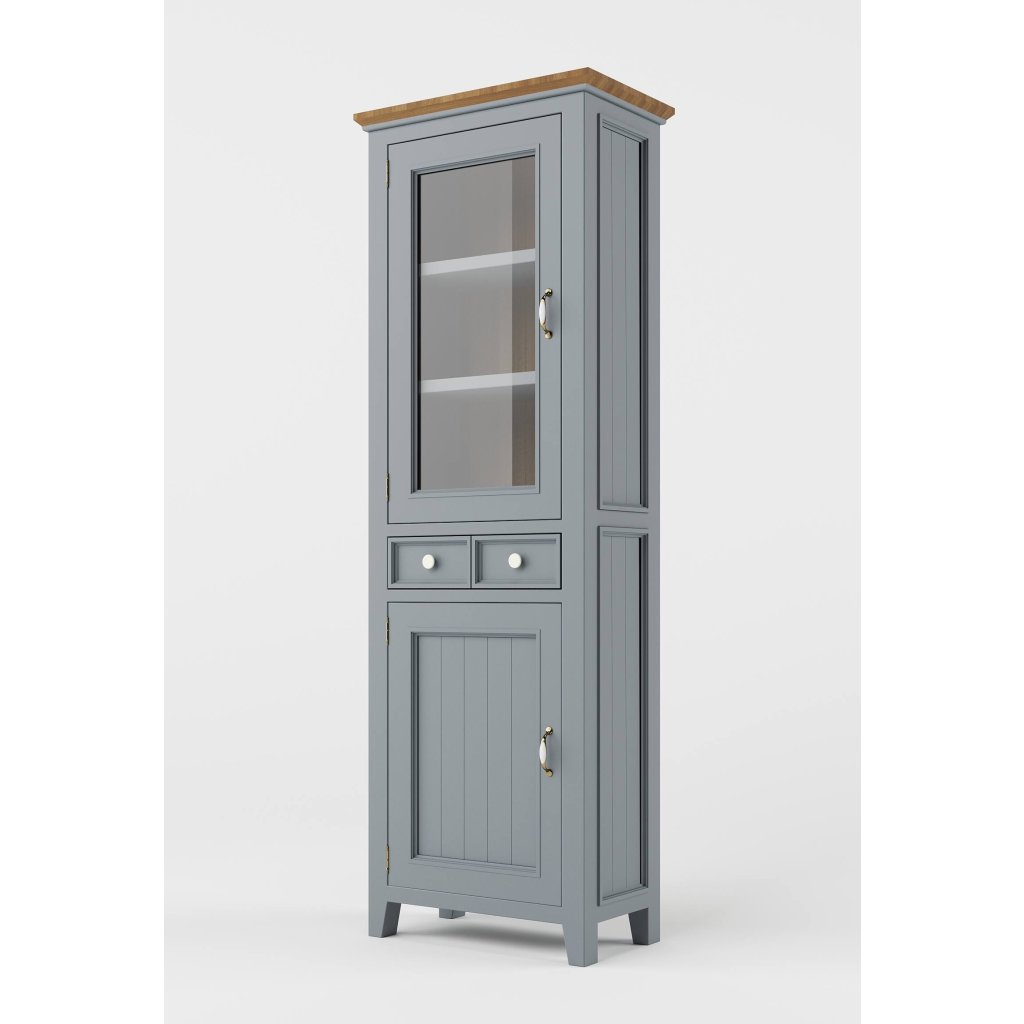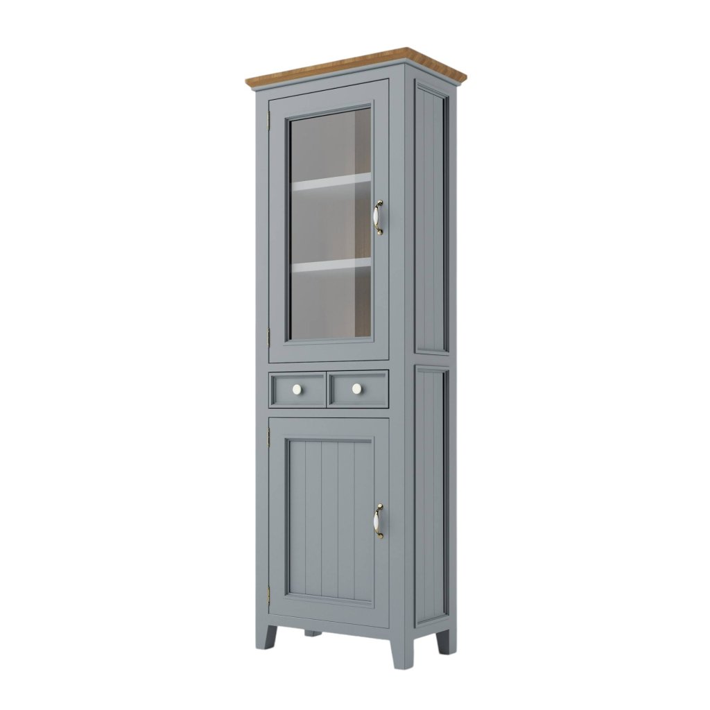 Masivní vitrína PROVENCE je spojením bukového a dubového dřeva. Dubové dřevo (horní deska) je ošetřeno lakem a bukové dřevo je ošetřeno akrylovou barvou v šedomodré barvě.