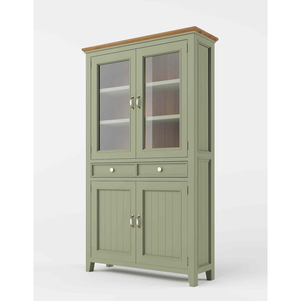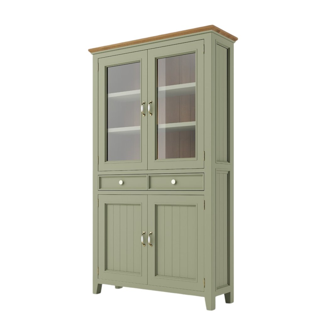 Masivní vitrína PROVENCE je prosklená vitrína vyrobená z masivního bukového dřeva, které je ošetřeno akrylovou barvou v olivovém odstínu, a z masivního dubového dřeva (horní deska), které je ošetřeno lakem. Díky spojení těchto dvou druhů masivního dřeva získala masivní vitrína jedinečný vzhled, který zdokonalí veškerý interiér.