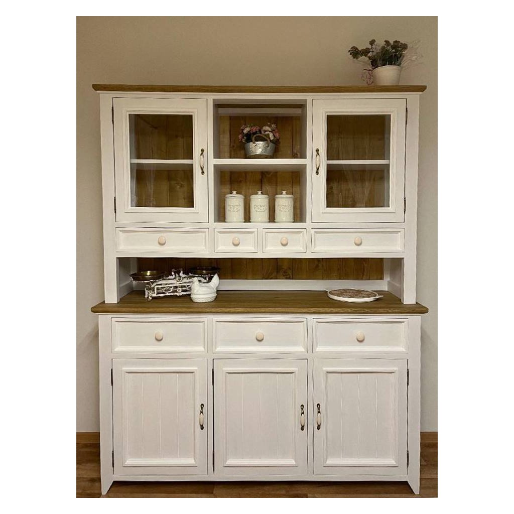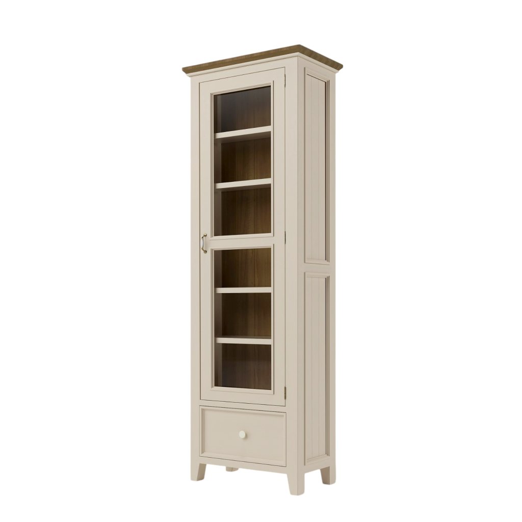 Masivní vitrína PROVENCE je prosklená vitrína vyrobená z masivního bukového dřeva, které je ošetřeno akrylovou barvou v krémovém odstínu, a z masivního dubového dřeva (horní deska), které je ošetřeno lakem. Díky spojení těchto dvou druhů masivního dřeva získala masivní vitrína jedinečný vzhled, který zdokonalí veškerý interiér.