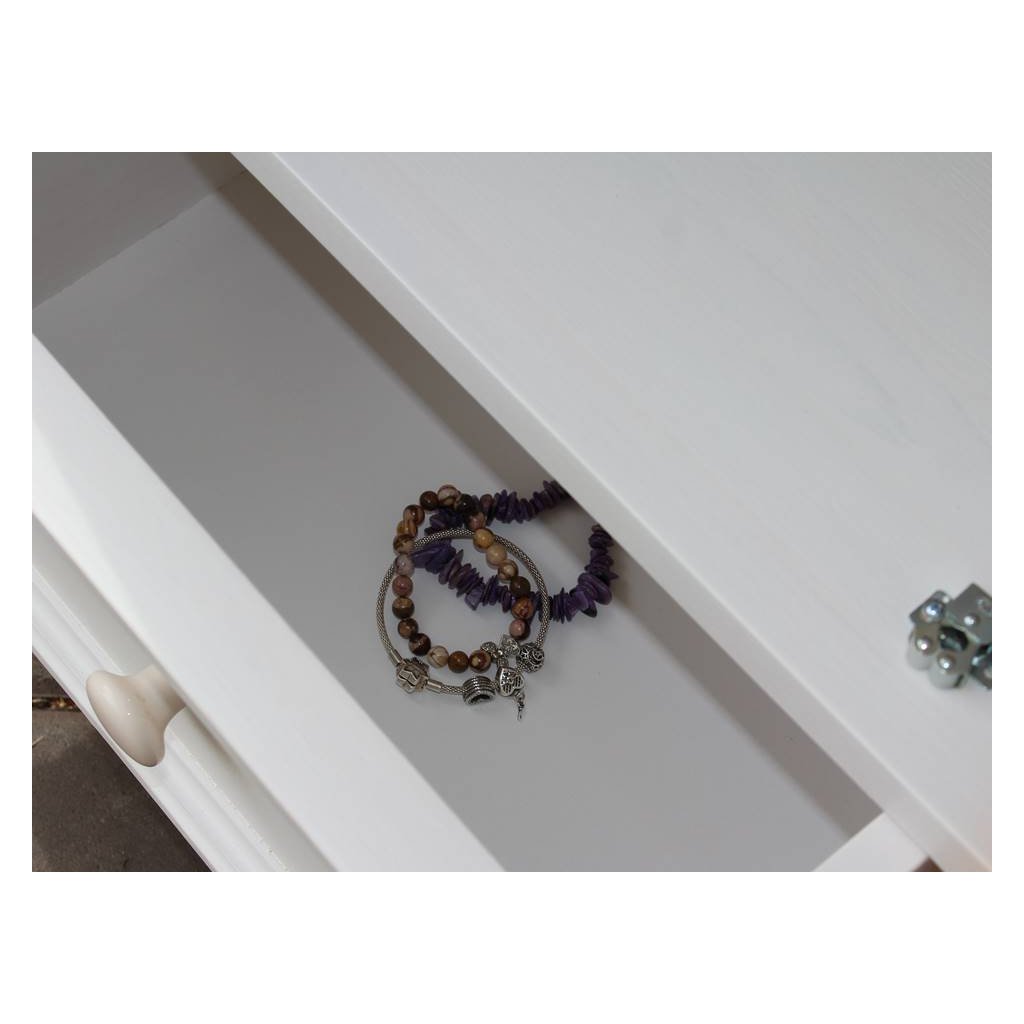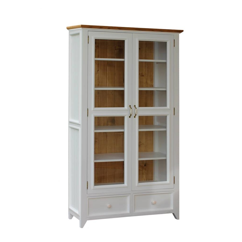 Masivní vitrína PROVENCE je spojením bukového a dubového dřeva. Dubové dřevo (horní deska) je ošetřeno lakem a bukové dřevo je ošetřeno akrylovou barvou v bílé barvě. Šuplíky jsou bez pojezdů. Možnost objednání se systémem tichého dovírání (u šuplíků).