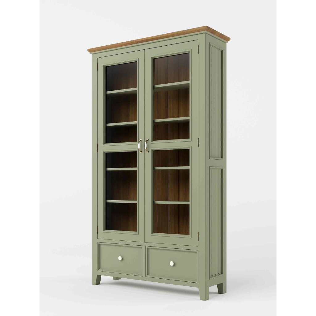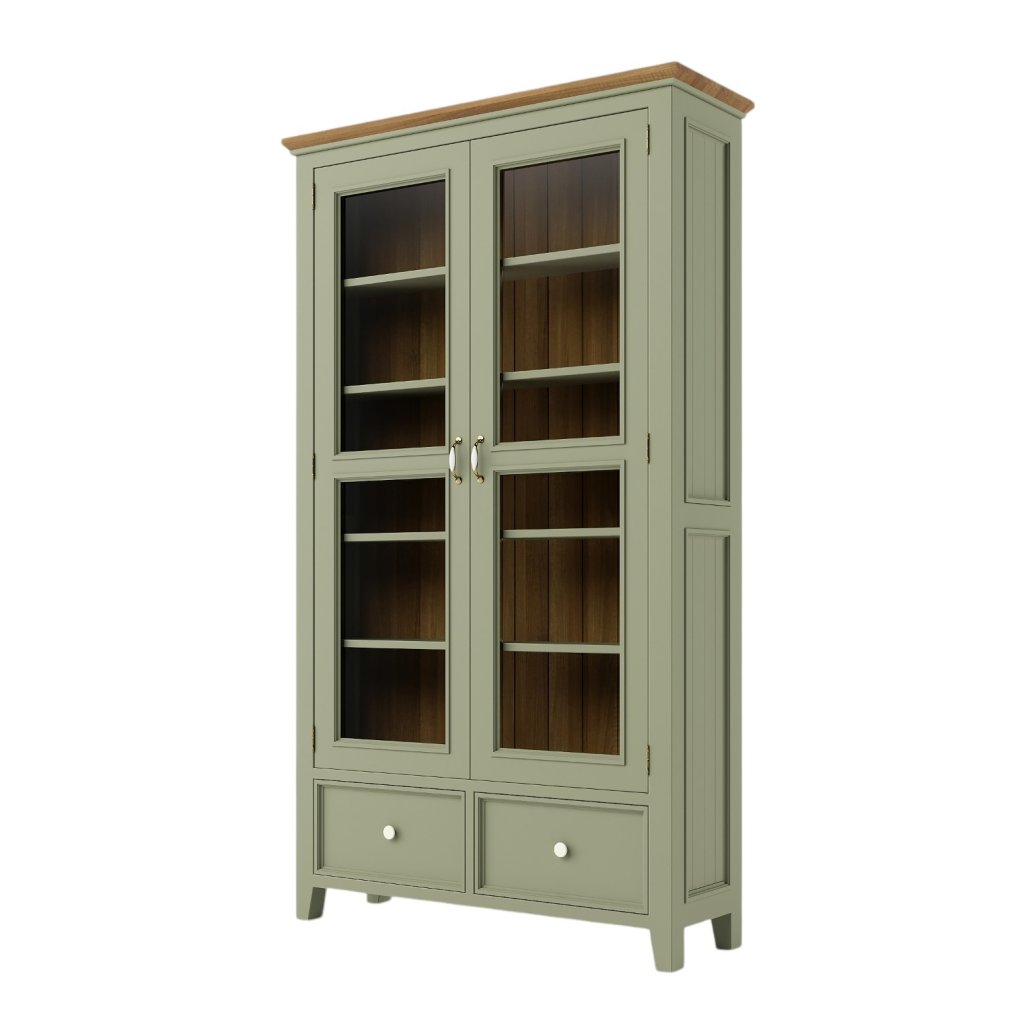 Masivní vitrína PROVENCE je prosklená vitrína vyrobená z masivního bukového dřeva, které je ošetřeno akrylovou barvou v olivovém odstínu, a z masivního dubového dřeva (horní deska), které je ošetřeno lakem. Díky spojení těchto dvou druhů masivního dřeva získala masivní vitrína jedinečný vzhled, který zdokonalí veškerý interiér.