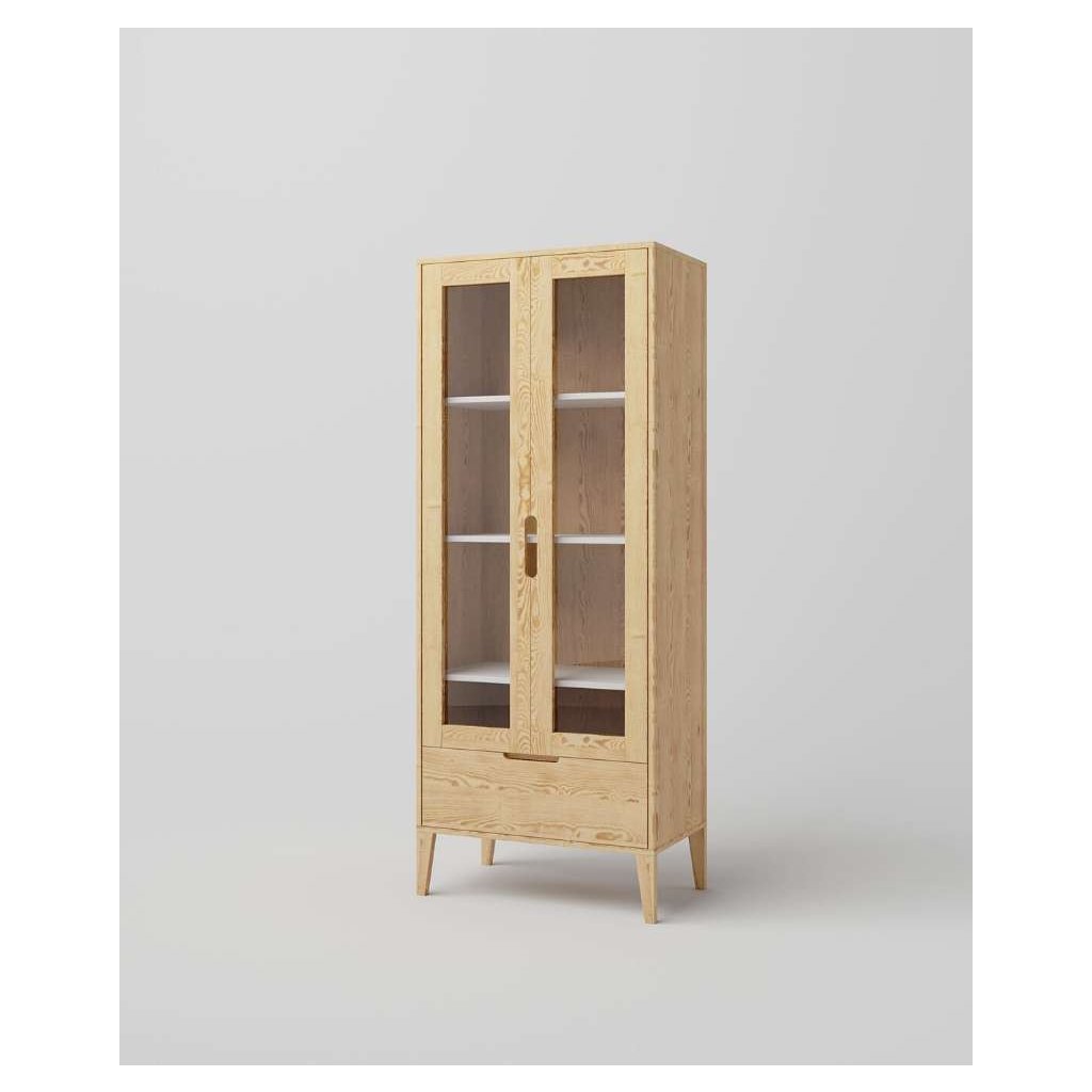 Vitrína z masivu RETRO Hast nabízí prosklenou skříňku s policemi a praktický šuplík, které poskytnou domov všem potřebným věcem.