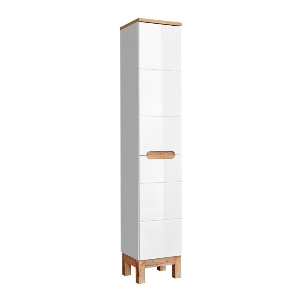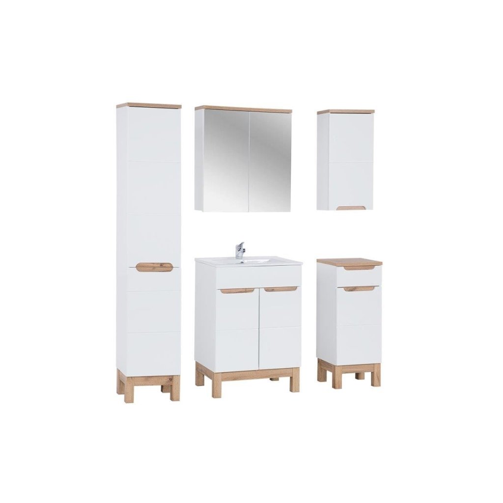 Korpus konstrukce je vyroben z kvalitního lamina bílé barvy, zatímco čelo skříňky je tvořeno lesklým MDF materiálem, taktéž bílé barvy. Moderní lesk a nevtíravá bílá barva se zde mísí s hřejivým dřevěným dekorem, který modelu propůjčuje příjemný vzhled. Skříňka dokonale zapadá do novodobých trendů interiérového designu, a to nejen svým jednoduchým tvarem, ale také frézováním rukojeti. Bílá barva opticky rozjasní prostor a podpoří v něm dojem čistoty.