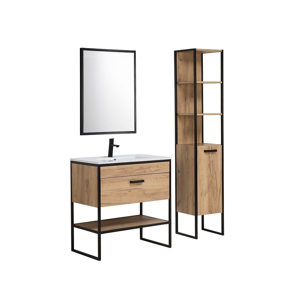Korpus regálu BROOKLIN je vyroben z kvalitního lamina v barvě dub craft zlatý, který působí příjemným dojmem. Korpus je upevněn v kovové konstrukci matné černé barvy, která krásně kontrastuje s hřejivým dřevěným designem lamina a vytváří tak zajímavý designový efekt, který podpoří vytvoření útulné atmosféry ve vaší koupelně.