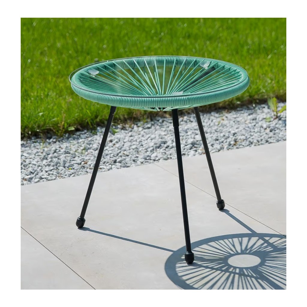 Zahradní stůl AQUATA mintový je vyroben z kvalitního syntetického pletiva (z plastového materiálu PE), který se vyznačuje vysokou odolností vůči povětrnostním vlivům, jako je déšť a UV záření. Jeho ocelový rám je opatřen práškovou barvou, která mu poskytuje ochranu proti korozi. Stolek je vybaven deskou z tvrzeného skla o tloušťce 5 mm, což zajišťuje jeho pevnost a stabilitu.