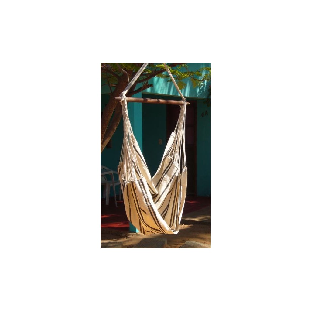 Závěsné houpací křeslo Brasil cappucino je vyrobeno z odolné tkaniny, která je odolná vůči UV záření a povětrnostním podmínkám. V místě, kde sezávěsné šňůry napojují na sedací plochu je potah 4x prošitý, takže je dostatečně pevný a odolný. Šňůry jsou pomoci úvazů napojeny na bukovou tyč tak, aby při používání nedocházelo ke sklouzávání do středu tyče a neohrozily tak bezpečnost uživatele. Tvar sedací plochy je určen pouze jednou tyčí a umožňuje tak sedícím zaujmout různé polohy.