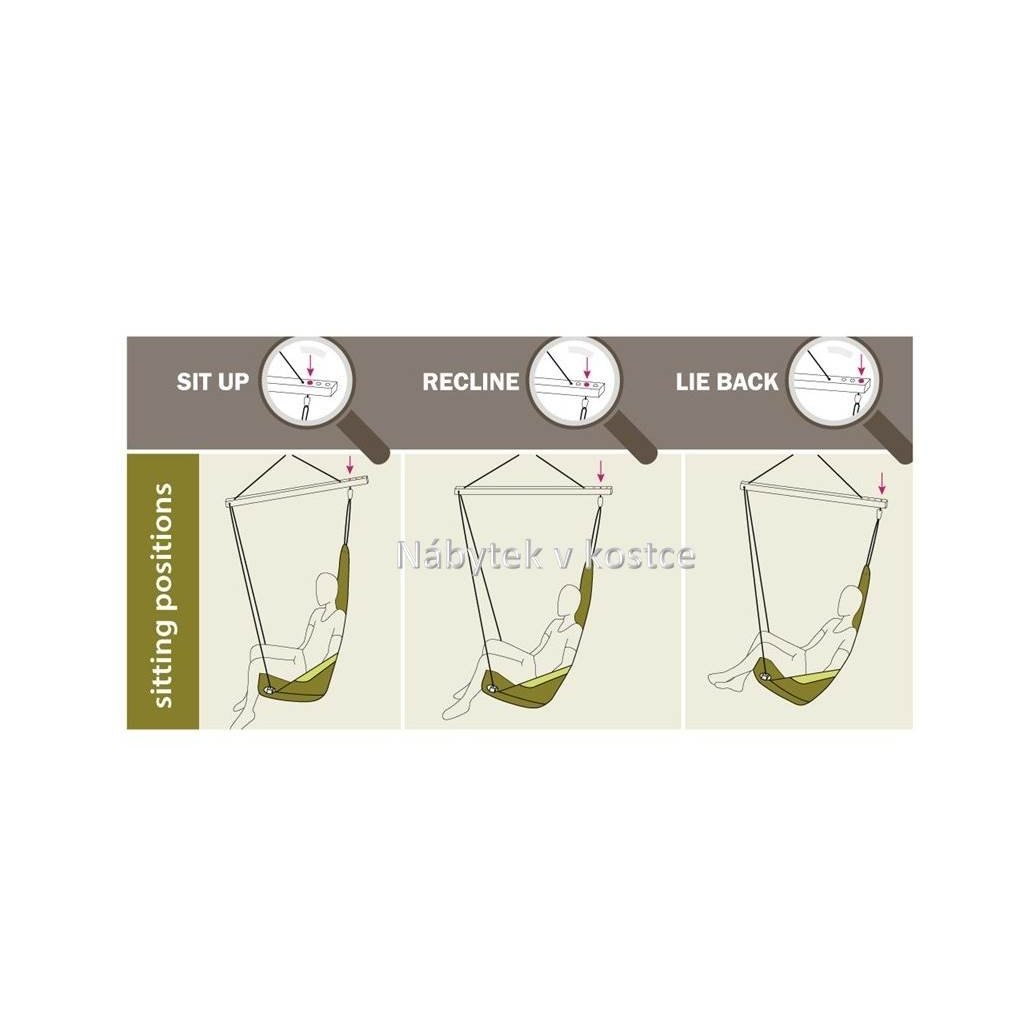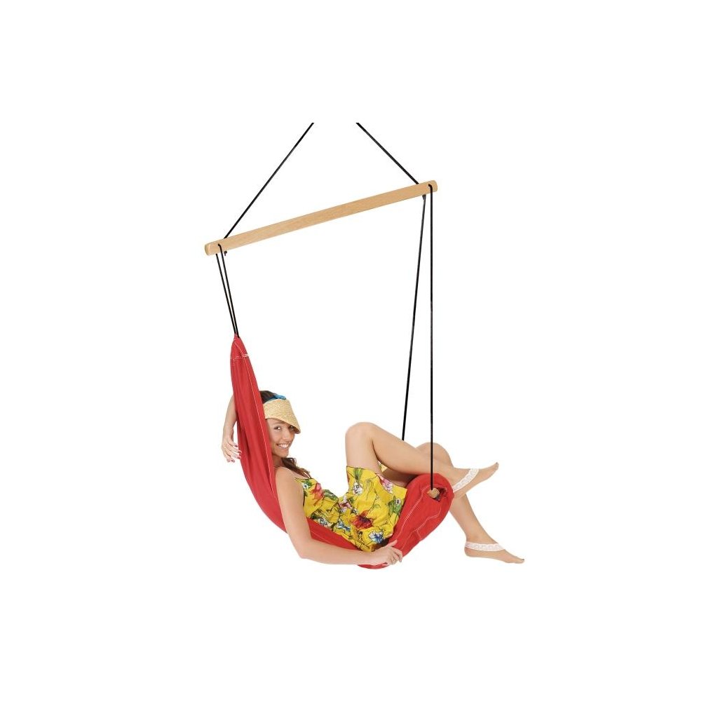 Výhodou závěsného houpacího křesla Hangover red je, že polohu křesla si můžete přesouváním své váhy stanovit sami, kdykoliv si budete přát, a to tak, že čím více váhu přenesete na opěradlo, tím více se vaše poloha přiblíží ležení v houpací síti. Celkový sklon křesla je možné regulovat změnou délky bočních lan.